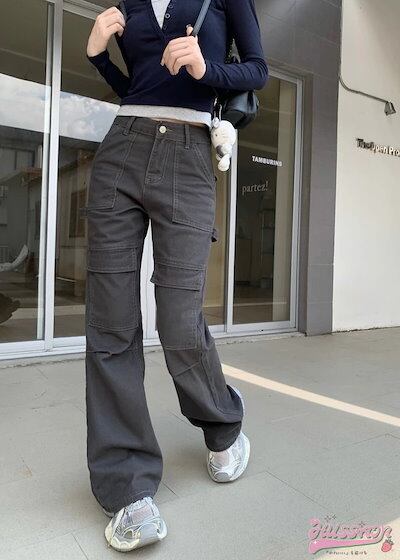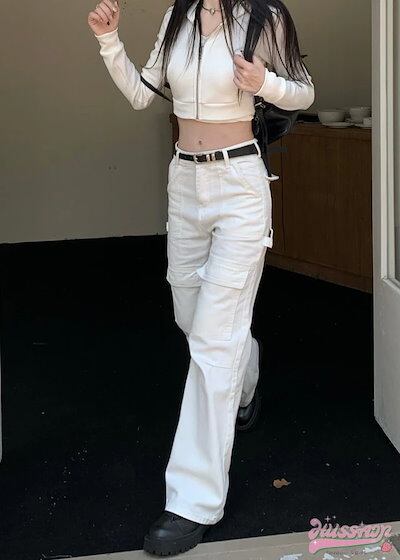 [cos衣料]パンツ カーゴパンツ ワイド ストレート ハイウエスト 脚長効果 美脚効果 細見え 白 カジュアル 韓国ファッション レディース お出かけ