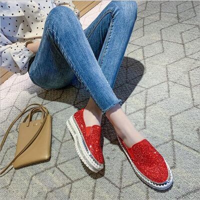 【今月の新品】女性 厚底 スリッポン スニーカー レディース 手作り リボン付き キラキラ ラインストン シュ