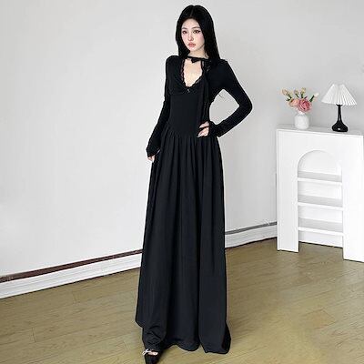 2025春夏 ロングワンピース マキシ丈 ワンピース 長袖 韓国系ファッションフィット パーティー切替きれいめ 韓国リブフレンチレディース 色っぽ 女っぽ黑白カジュアル大人