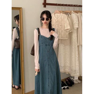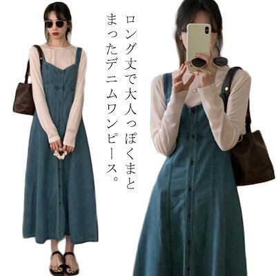 デニム サロペットワンピース ジャンパースカート サロペットスカート サロペット S-XL ロング マキシ丈 秋 Aライト ワンピース レディース デニム生地 体型カバー 前開 オーバーオール