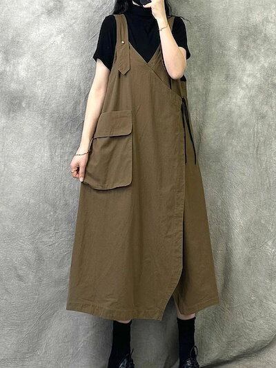 ジャンパースカート サロペット Aライン レディース リネンワンピース スカート ワンピース ロングスカート 切り替え ロング丈 マキシ丈 ポケット付き 体型カバー シンプル 薄手 着痩せ 重ね着 マ