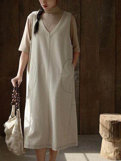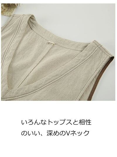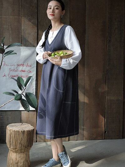 RINNEジャンパースカート Aライン レディース リネンスカート リンネ ワンピース スカート ロングスカート ロング丈 マキシ丈 麻 ポケット付き Vネック ジャンパー 体型カバー シンプル 薄手 細見え