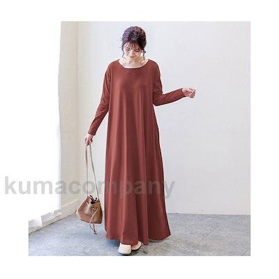 マキシ丈 ワンピース レディース Aライン 体型カバー 長袖ワンピース 無地 ゆったり ロングワンピ クルーネック シンプル レトロ ドレス