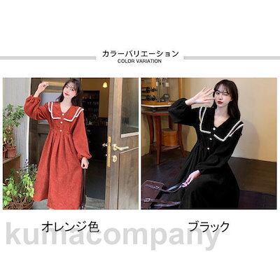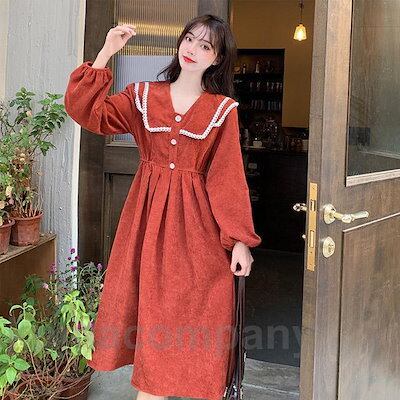 ロングワンピース レディース フレアワンピース 無地 大きい襟 長袖 ゴム袖 膝下丈 ボタン付き 柔らかい ゆったり シンプル 春秋