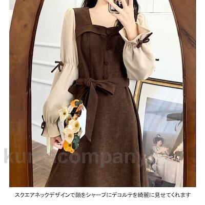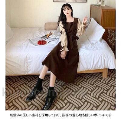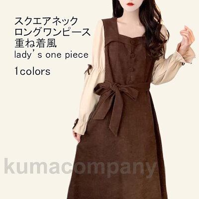 ロングワンピース レディース ドッキングワンピース 無地 スクエアネック フリル 重ね着風 膝下丈 ベルト ゆったり シンプル 春秋