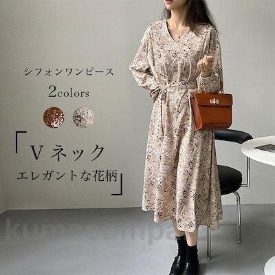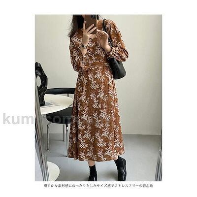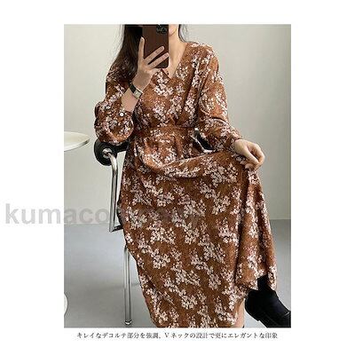 シフォンワンピース 花柄 レトロ レディース 長袖ワンピース Vネック 春 秋 ワンピース エレガント ロングワンピ ゆったり ベルト付き 柄ワンピ