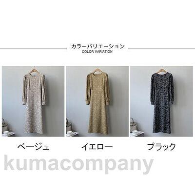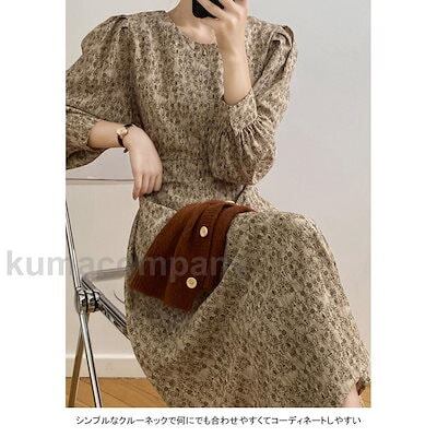 ロングワンピース レディース 花柄ワンピース クルーネック 長袖 フレア ボリューム袖 ファスナー付き 紐付き ゆったり 着回し 春夏秋