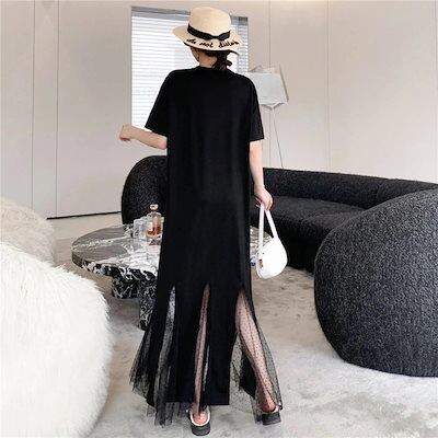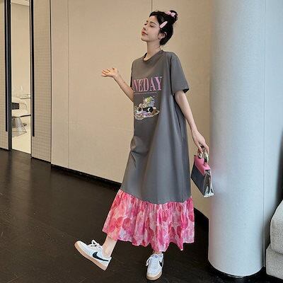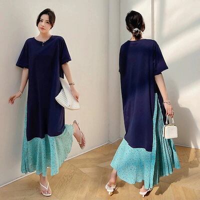 夏 韓国ファッション ワンピース レディース Tシャツ ワンピース 半袖 ラウンドネック 色切り替え ロングスカート プリーツ 体型カバー 大人可愛い 大きいサイズ ゆったり