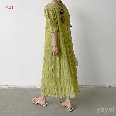 [即納]ワンピース 半袖 春 夏 レディース ロングワンピース プリーツ ミディアム丈 ひざワンピース カジュアル風 体型カバー 無地 ドレス ゆったり 着痩せ 40代