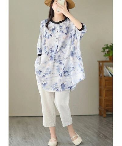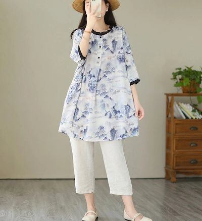 花柄 チュニック 半袖 ブラウス レディース 春夏 綿麻風 シャツ ロング丈 プリント スタンドカラー ボタン チュニック丈 シャツブラウス 大きいサイズ ゆったり トップス 体型カバー 涼しい 薄手