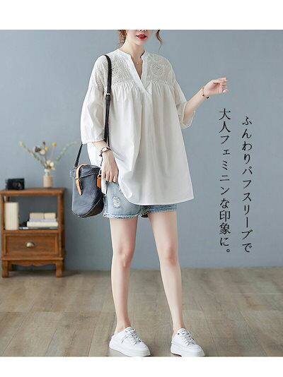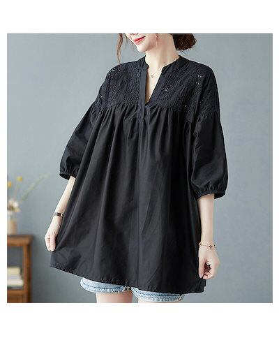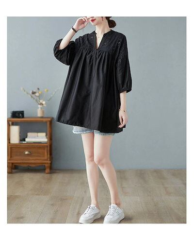 パフスリーブ ブラウス レディース 半袖 チュニック 透かし彫り 刺繍 Vネック ギャザー シャツブラウス ロング 春夏 タック プルオーバー トップス 大きいサイズ ゆったり 薄手 無地 ブラック
