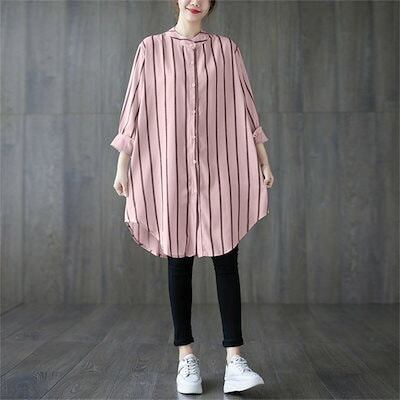 ロングシャツ レディース 綿 シャツ チュニック 長袖 立ち襟 ストライプ 長袖シャツ 前開き コットン 綿混 トップス 羽織り ボタン ゆったり 体型カバー シンプル カジュアル シャツブラウス き