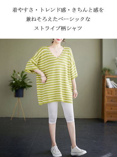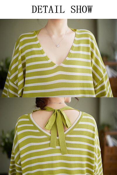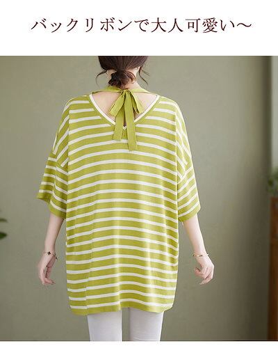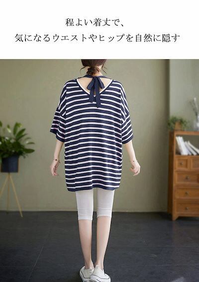 ボーダー チュニック レディース tシャツ 半袖 トップス ロング丈 バックリボン ドロップショルダー vネック ロンT プルオーバー 切り替え Tシャツ ゆったり 大きいサイズ 綿混 ベーシック 大