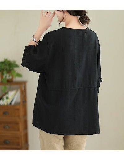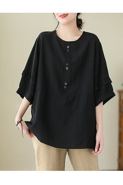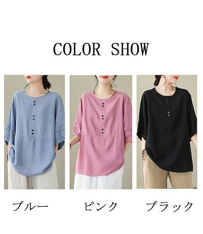 半袖ブラウス レディース 夏 チュニック ゆったり ロングシャツ 半袖 ラウンドネック フリル ボタン シャツブラウス 大きいサイズ 綿混 コットン トップス 体型カバー プルオーバー 無地 ベーシッ