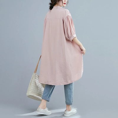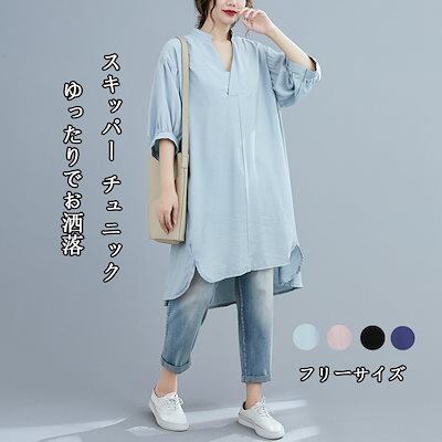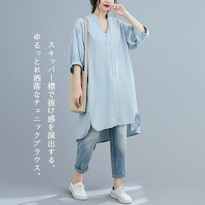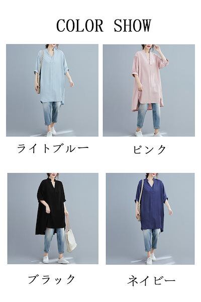 ロングシャツ レディース チュニック 半袖 スキッパー シャツ タック 五分袖 トップス 綿混 前後差 vネック プルオーバー シャツブラウス ゆったり 大きいサイズ 無地 ライトブルー ピンク 体