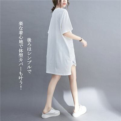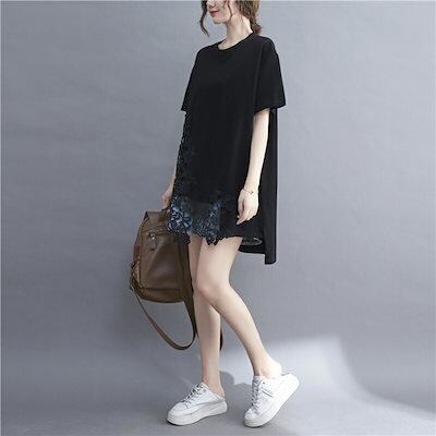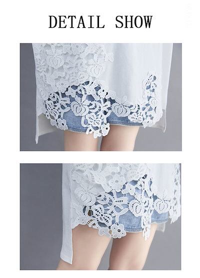 レース チュニック レディース ロングtシャツ 半袖 トップス ドッキング Tシャツ 花柄レース 5分袖 夏tシャツ プルオーバー 透かし 切り替え 異素材 シャツブラウス 春夏 無地 ゆったり 体型