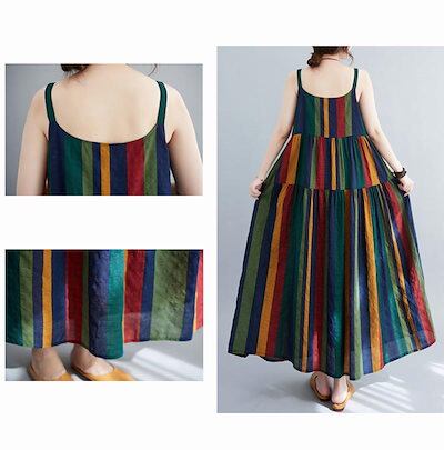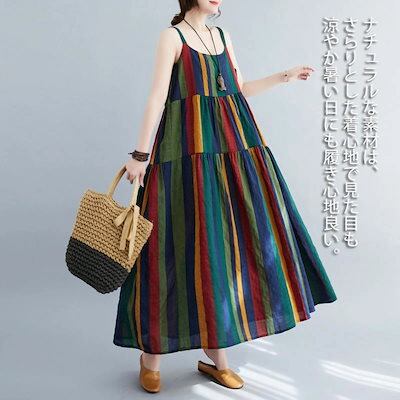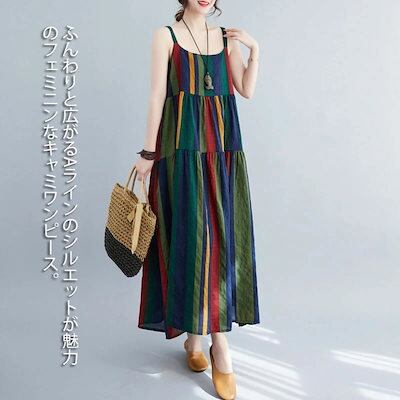 キャミワンピース 切り替え ジャンパースカート レディース 春 夏 綿 Uネック プリント ロングワンピース ストライプ レイヤード 総柄 重ね着 サロペット ワンピース フレア ゆったり 体型カバー