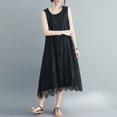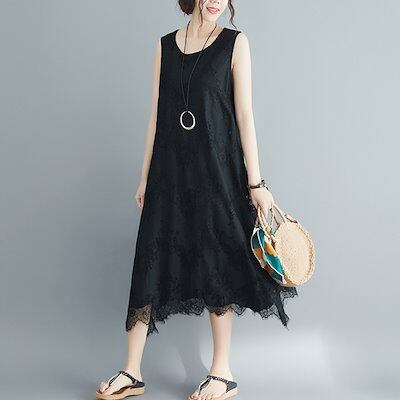 レースワンピース ノースリーブ レディース ジャンパースカート 総レース ロングワンピース 春 夏 Uネック 裏地付き 刺繍 花柄 Aライン フレア ゆったり 体型カバー ワンピース きれいめ ナチュ