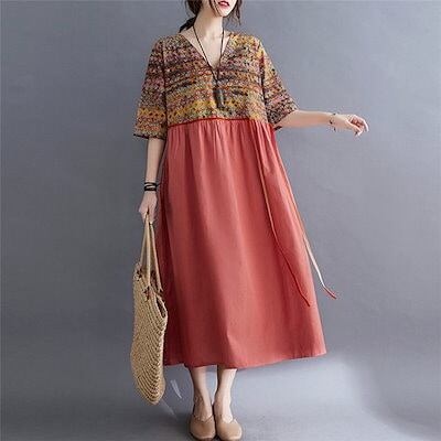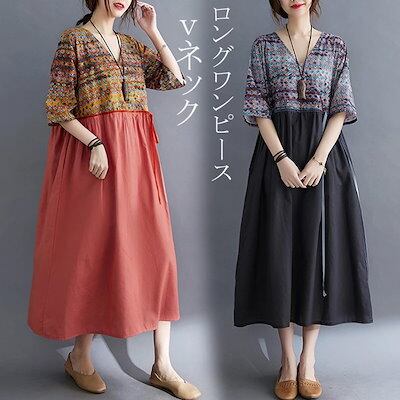 ワンピース レディース 夏 ロングワンピース Aラインスカート フレアスカート aラインスカート 半そで Vネック ロングワンピ 切替ワンピース ロング丈 ゆったり 綿麻混 おしゃれ 可愛い きれいめ