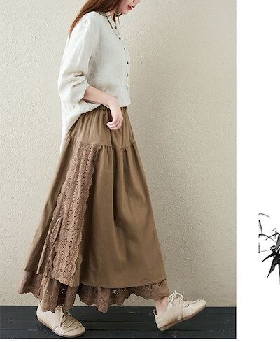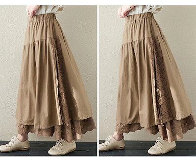 スカート レディース ロング丈 ボトムス 刺繍 花柄 ペチコート レース カットワーク レース 2層構造 柔らかい 綿 ナチュラル ゆったり カットワーク ウエストゴム 体型カバー 上品 ゆった