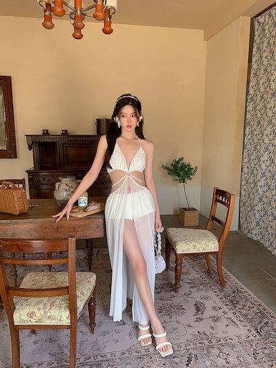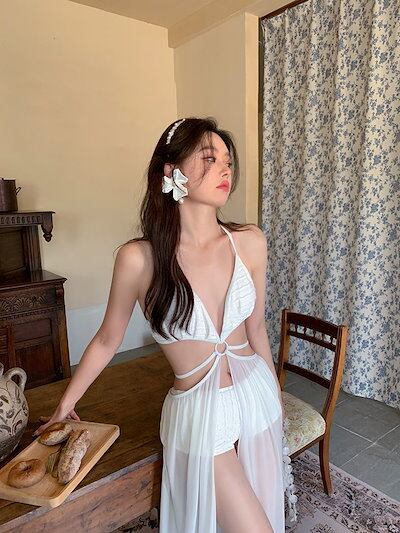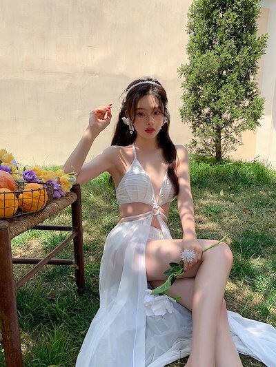 【メガ割 】水着 S スイムウェア 水着 ワンピースVネックセクシー背中見せ純欲風白ルスカートリゾート水着 涼しく楽ちんセットアップ