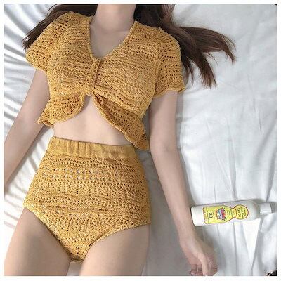 水着レディース 体型カバー ビキニ水着 セパレート ビキニ2点セット 三角パン水着 半袖 ニット風 小胸バンドゥ 40代 セクシー スイムウェア 温泉 上品