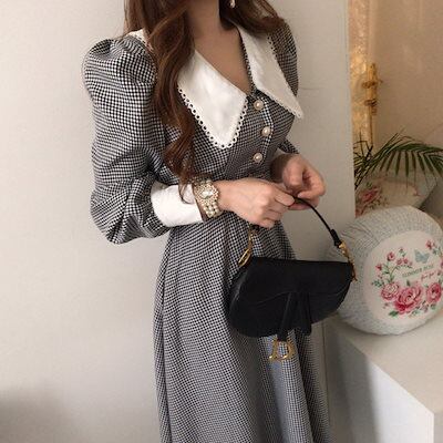 韓国chicの春のチェック ワンピース セレブ レディース 長袖 フレンチ ワンピース ベルト 通勤 OL ファッション 新品追加