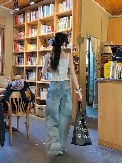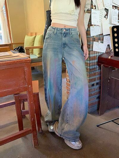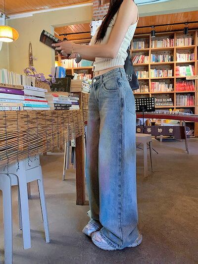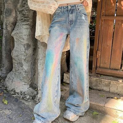 2024春夏パンツ デニム ジーンズ レインボー 虹色 ワイド ストレート ハイウエスト 脚長効果 美脚効果 細見え 春 カジュアル おしゃれ かわいい 韓国ファッション レディース お出かけ