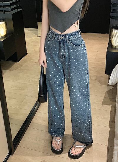 2024春夏パンツ デニム ジーンズ ドット柄 ワイド ストレート ハイウエスト 脚長効果 美脚効果 細見え 春 カジュアル おしゃれ かわいい 韓国ファッション レディース お出かけ