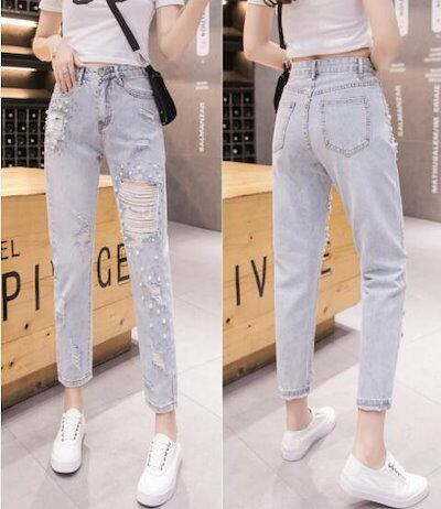 2024網赤春服新型破穴ジーンズ女性真珠型9分ズボン釘珠で痩せて見える