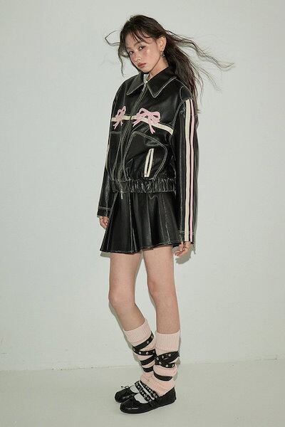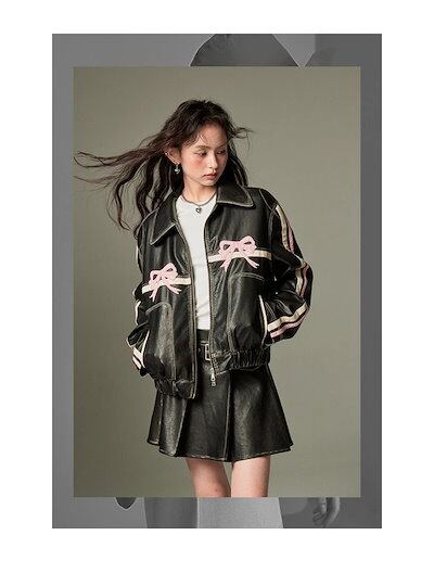 2024 秋冬 甘くてかっこいい 長袖 韓国ジャケット かわいい ショート アウター ブラック 羽織り春レディースレトロ合成 バイカラーカジュアル 女っぽ きれいめ ファッション 色っぽ 大人フェイク