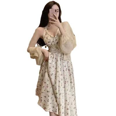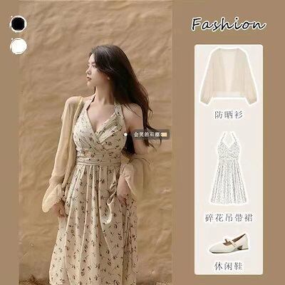 キャミワンピース パーティードレス 気質ウエストスリムネッククラッシュフラワードレス女性夏薄い日焼け止めシフォンカーディガン2ピーススーツをぶら下げ 韓国ファッション