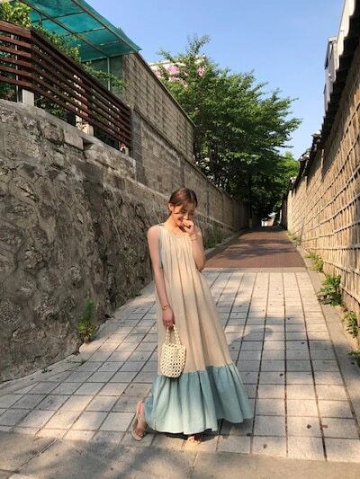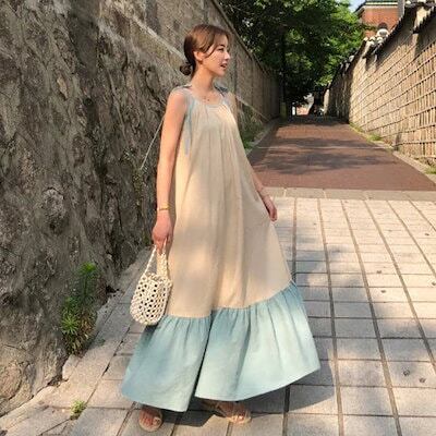 2025夏の新作韓国系ゆったりファッション衝突カラーパッチワークリゾート風スカートワンピースレディースロングスカート