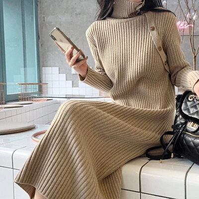 ワンピース ゆったり ロング ジャンパースカート 膝 レディース 秋冬新作 ハイネック ニットワンピース ミドル丈 インナー ボトムワンピース 韓国ファッション