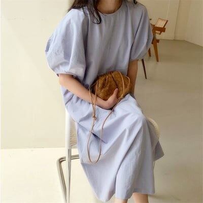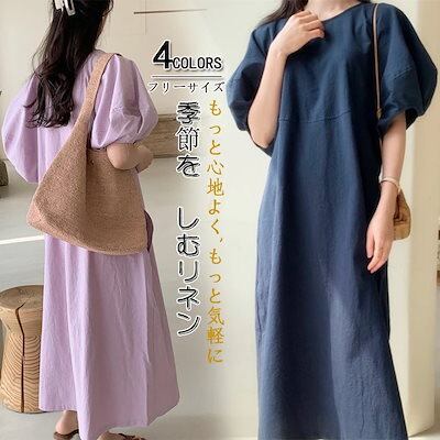 夏のワンピース 綿麻 バブル袖 ワンピ レディース 無地 ロングスカート 着痩せ
