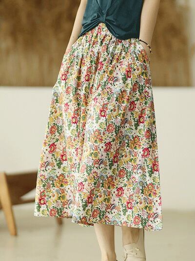 2024新品発売花柄スカート ひざ丈 夏 綿 ロングスカート 春 ウエストゴム フレアスカート 花柄 スカート 春夏 ミモレ丈 低身長 ボトムス レディース 体型カバー ロンスカ ゴム 大きいサイズ