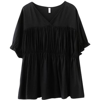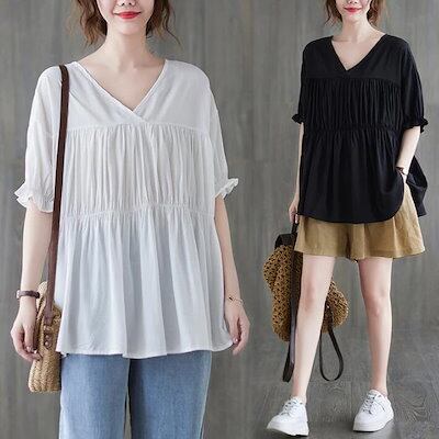 ブラウス レディース 半袖 ギャザーブラウス シャツ シャツ フレンチスリーブ フリル Vネック 5分袖 大きめ オーバサイズ サイズ 体型カバー 透け 涼しい 夏
