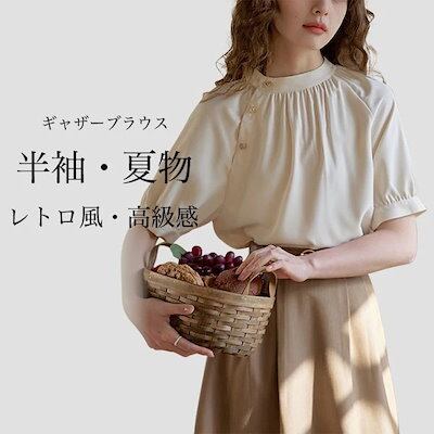 【短納期】サマーブラウス レトロ レディース ギャザーブラウス 半袖 高級感 サテン プルーオーバー 半袖Tシャツ クルーネック 夏Tシャツ 半袖ブラウス 無地 夏 トップス 薄手 サマーTシャツ