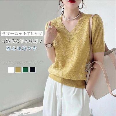 サマーニット ニットソー レディース シャツ 無地 春 夏 ニット トップス ブラウス Tシャツ シャツブラウス 体型カバー 半袖 ニットカットソー