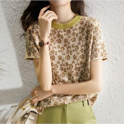 Tシャツ レディース 40代 春夏新作 上品Tシャツ ブラウス おしゃれ 花柄 インナー 薄手ニット 半袖トップス カジュアル 韓国風 大人通勤 ゆったりtシャツ 30代