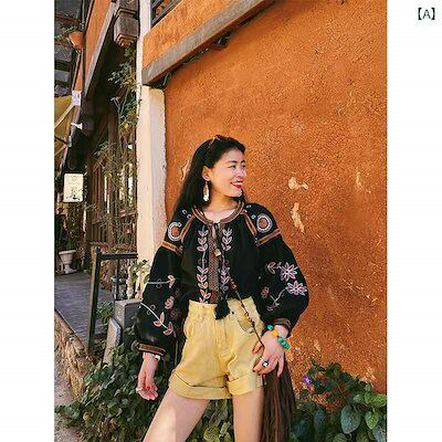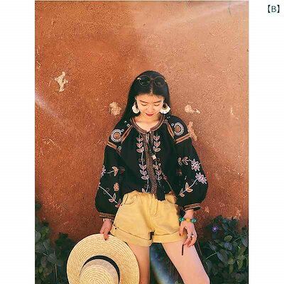 レディース ファッション シャツ パンツ トップス ショート ズボン ブラウス 女性 刺繍 ランタン スリーブ