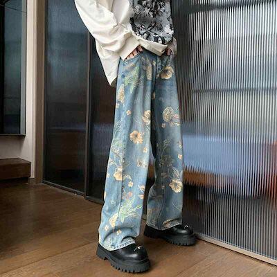 ミッドウエストコーデ メンズ 用 シンプル ファッション オシャレ かっこいい 大きいサイズ ストリート 紳士 レディース プリント 花柄 ワイド レッグ ウォッシュ ジーンズ ミッドウエスト ストレート スリム