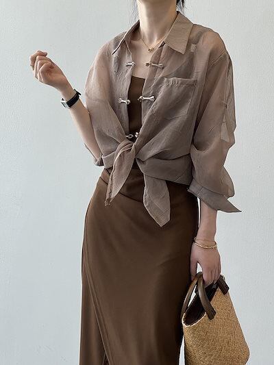 チャイナ風2024夏ゆったり薄手 uvカットシャツ+キャミソールワンピースセットアップ通気性のいい涼しく楽ちんセットアップ紫外線対策セットアップ