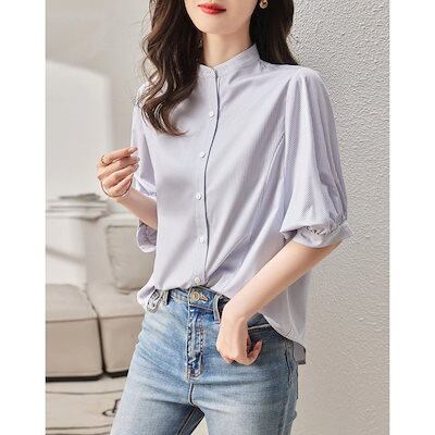 ストライプシャツサテンシャツ春夏のストライプシャツ半袖ルーズクルーネックトップスブラウス