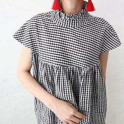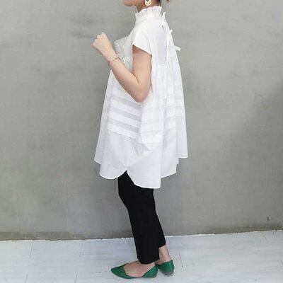 ストライプシャツ日韓半袖半タートルネック雰囲気通勤背中締めシャツサテンシャツネック クルーネッククルーネックトップス体型カバーチュニック