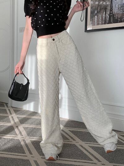2024 春夏パンツ デニム ジーンズ モップパンツ ジャガード 菱形 ワイド ストレート ハイウエスト 脚長効果 美脚効果 細見え 春 白 ホワイト カジュアル 韓国ファッション レディース お出か