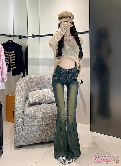 2024春夏 アメリカン パンツ デニム ブルー ジーンズ ロング丈 スキニー レッグ加工 ハイウエスト 脚長効果 美脚効果 細見え 秋 カジュアル 韓国ファッション お出かけ