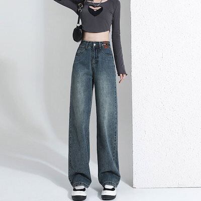 2024春夏 新作 レトロ ゆったり ハイウエスト デニムパンツ モップパンツ 着痩せ カジュアル 気質スラックスパンツ 韓国ファッション スキニーパンツ 脚長効果! ひんやりボトムス