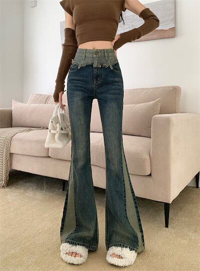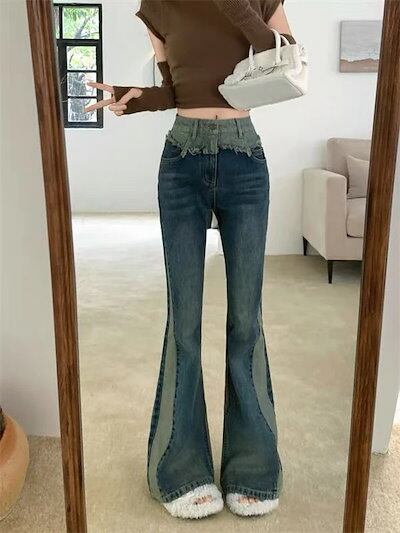 工ガ割-スプライスマイクロフレア 大きいサイズ ジーンズ レディース ハイウエスト 2025春秋 スリムフィット レトロ感 フロアレングス ベルボトム