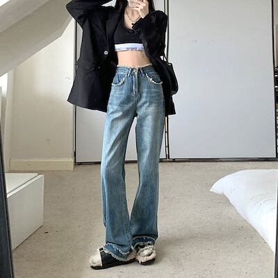 2024春夏 新作 レトロ 着痩せ デニムパンツ ハイウエスト 流行り ワイドパンツ 気質スラックスパンツ 韓国ファッション スキニーパンツ 脚長効果! ひんやりボトムス